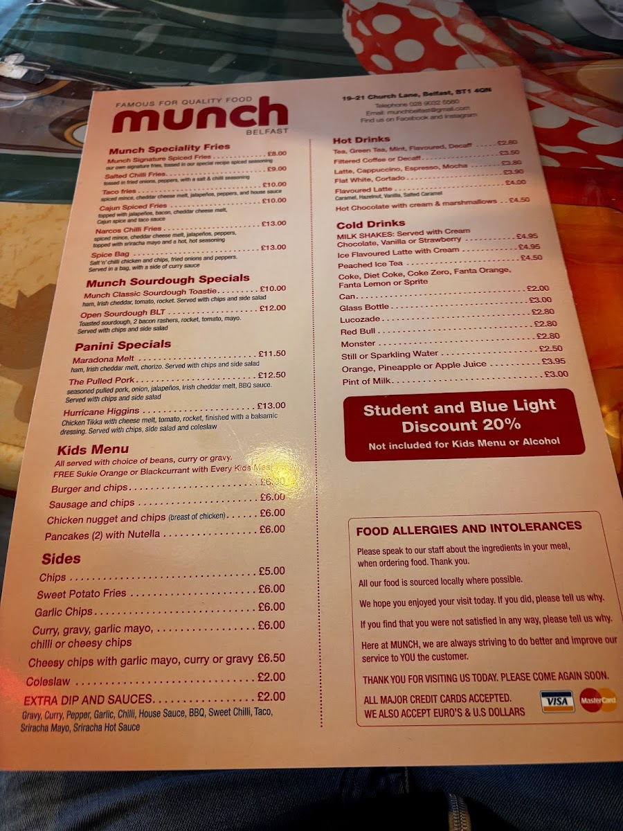 Welcome to Munch Belfast, a delightful café nestled in the heart of Belfast at 19-21 Church Lane. With an inviting atmosphere and a vibrant, fun décor, Munch Belfast elevates the café experience with a menu that features an exciting range of fries – from Munch Signature Spiced Fries to Narcos Chilli Fries, there’s something for every palate. Priced reasonably for £9.00 to £13.00, these fries are perfect for sharing or indulging solo.